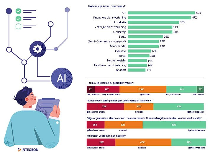 Het artikel laat zien dat AI-gebruik sterk geconcentreerd is bij het hoger management. 57% van de directieleden gebruikt AI, terwijl dat bij uitvoerende medewerkers zonder klantcontact slechts 17% is. Volgens Integron is dat een gemiste kans, omdat juist op de werkvloer winst te behalen valt in werkverlichting, klantgerichtheid en werkplezier.